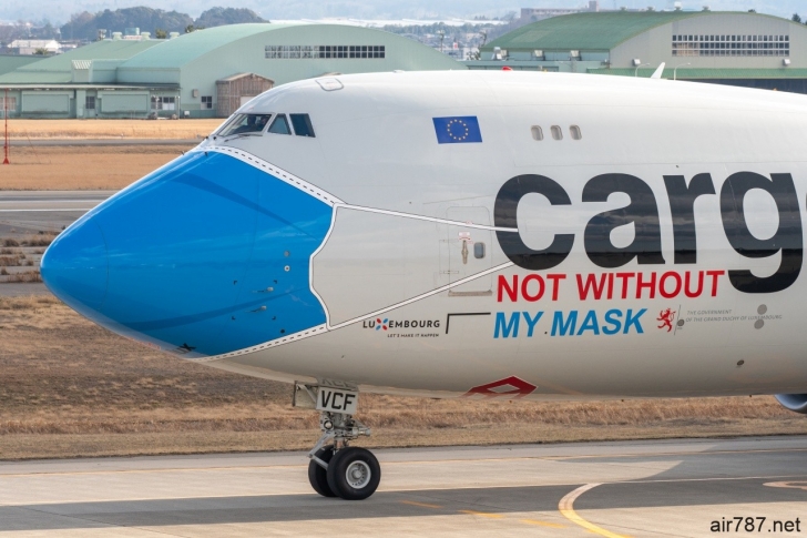 ボーイング747-8F LX-VCF。機首に青色のマスクを着けており、ロゴの「X」に紐をひっかけています。
