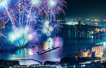 毎年8月8日前後に滋賀県大津市の琵琶湖で開催されるびわ湖大花火大会を、打ち上げ場所から2km ほど離れた山にある展望台「長等山テラス」から撮影しました。琵琶湖沿いに立ち並ぶマンションやホテルと琵琶湖花火を重ねて見下ろす構…