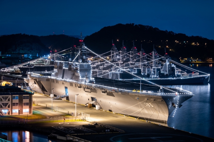 観艦式すべての来場者を横須賀だけで捌ききれないので、艦艇は海上自衛隊の基地以外のふ頭にも停泊しています。観艦式の1週間前から停泊し、日中は満艦飾、日没後から22時まで電灯艦飾が行われています。満艦飾は万国旗を、電灯艦飾では電灯を自衛艦に飾り付けライトアップ、シルエットが浮かび上がります。