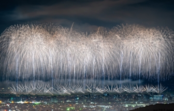 毎年8月8日前後に滋賀県大津市の琵琶湖で開催されるびわ湖大花火大会を、打ち上げ場所から2km ほど離れた山にある展望台「長等山テラス」から撮影しました。琵琶湖沿いに立ち並ぶマンションやホテルと琵琶湖花火を重ねて見下ろす構…